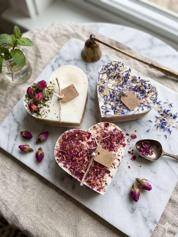 Beauty scents hand made scented natural wax heart candles 12cm wide x 5cm deep with real dried flowers and petals.